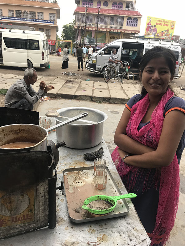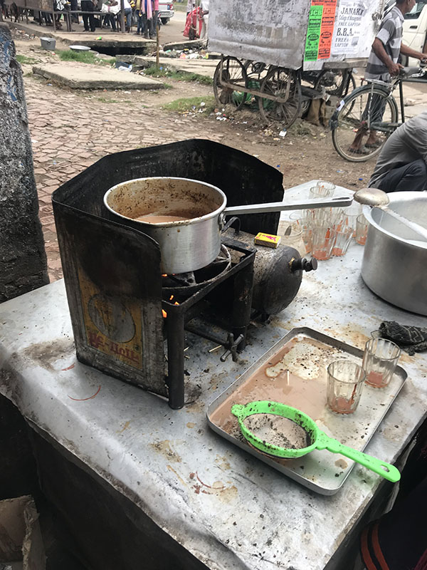 今日は楽しみにしていた土着のアート、ミティラーアートの工房へ♪日中は暑すぎるので朝早起きして行くことにしました。まずは外で熱いミルクティー「チヤ」とビスケット♪早朝からたくさんの人が外でチヤを楽しんでいます。とても美味しい甘さ控えめのチヤを毎朝2杯ずついただきました♪