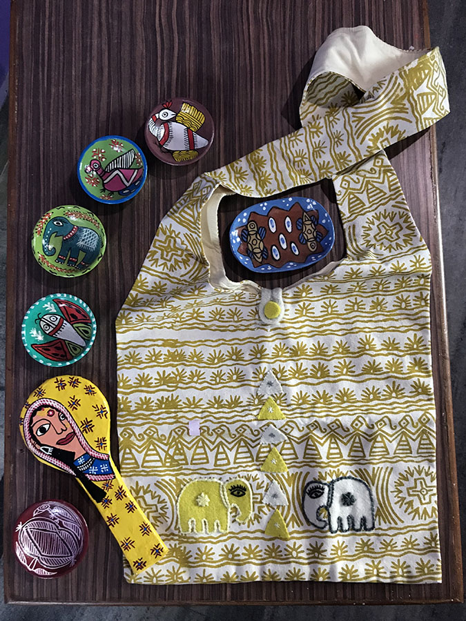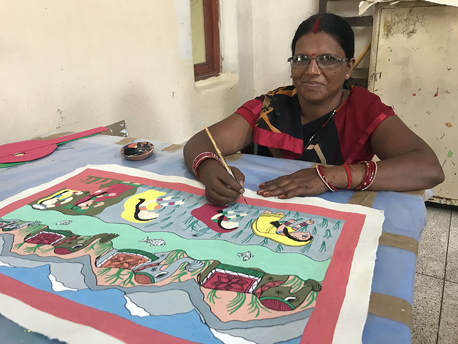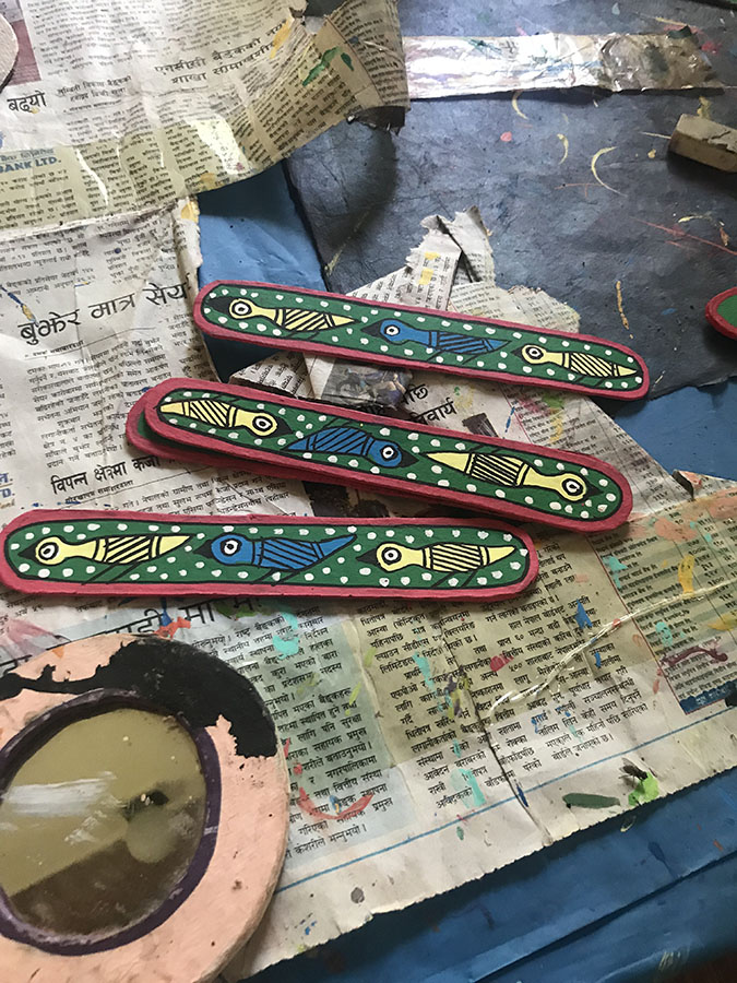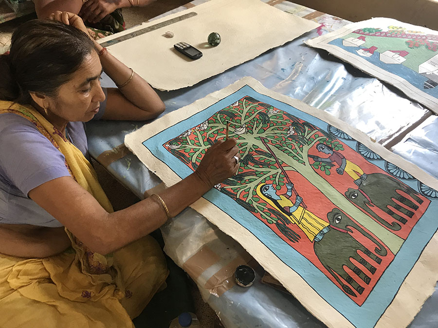 ミティラーアートの工房。こちらは女性の自立支援のために設立されたものです。元々はクワ村の女性たちが家の壁に泥で絵を描くという土着のアートだったものを、工芸作品にして制作販売しています。ゆっくりのんびり穏やかに時が流れています。