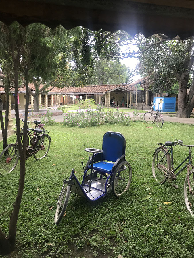 お庭には車椅子を改造した便利な乗り物が!これでおうちから通っているらしいです。