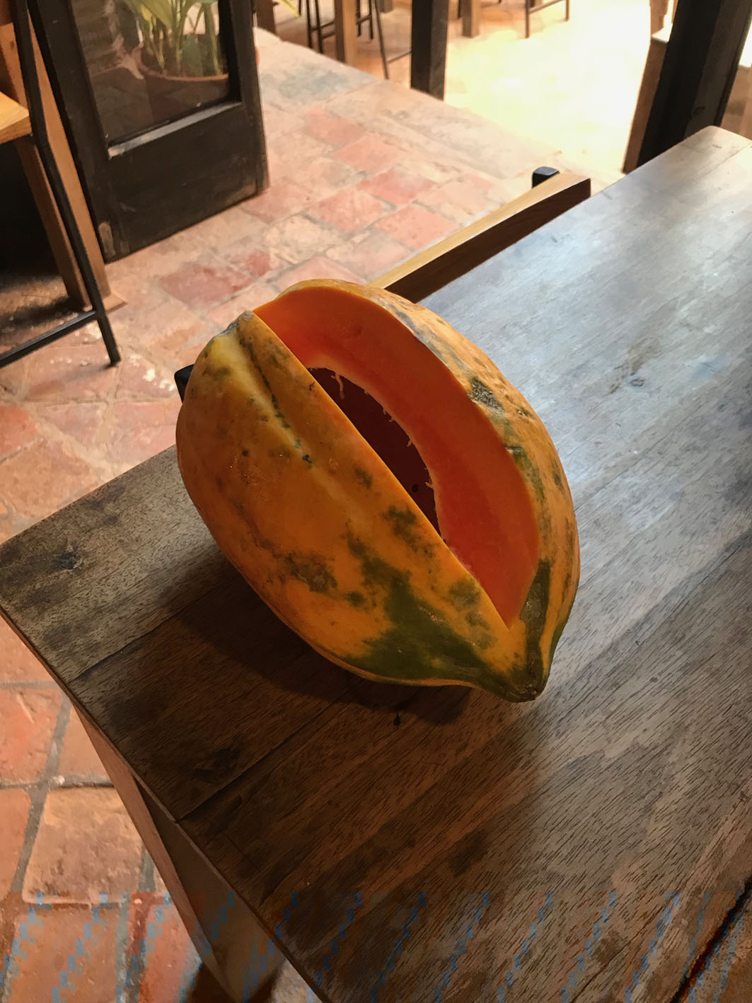 そんな中、アルーン(ゲストハウスのオーナーでインディラのご主人)がずっしりと重い肉厚のパパイヤをゴロンとテーブルの上に置きました。こんな大きなまるごとのパパイヤを初めて見た私は息を飲みました。なんて美味しそう…。濃厚な香り。フルーツ大好きな私はすぐさま「食べたい!」とねだり、インディラの娘のルニバとモリモリ食べました。