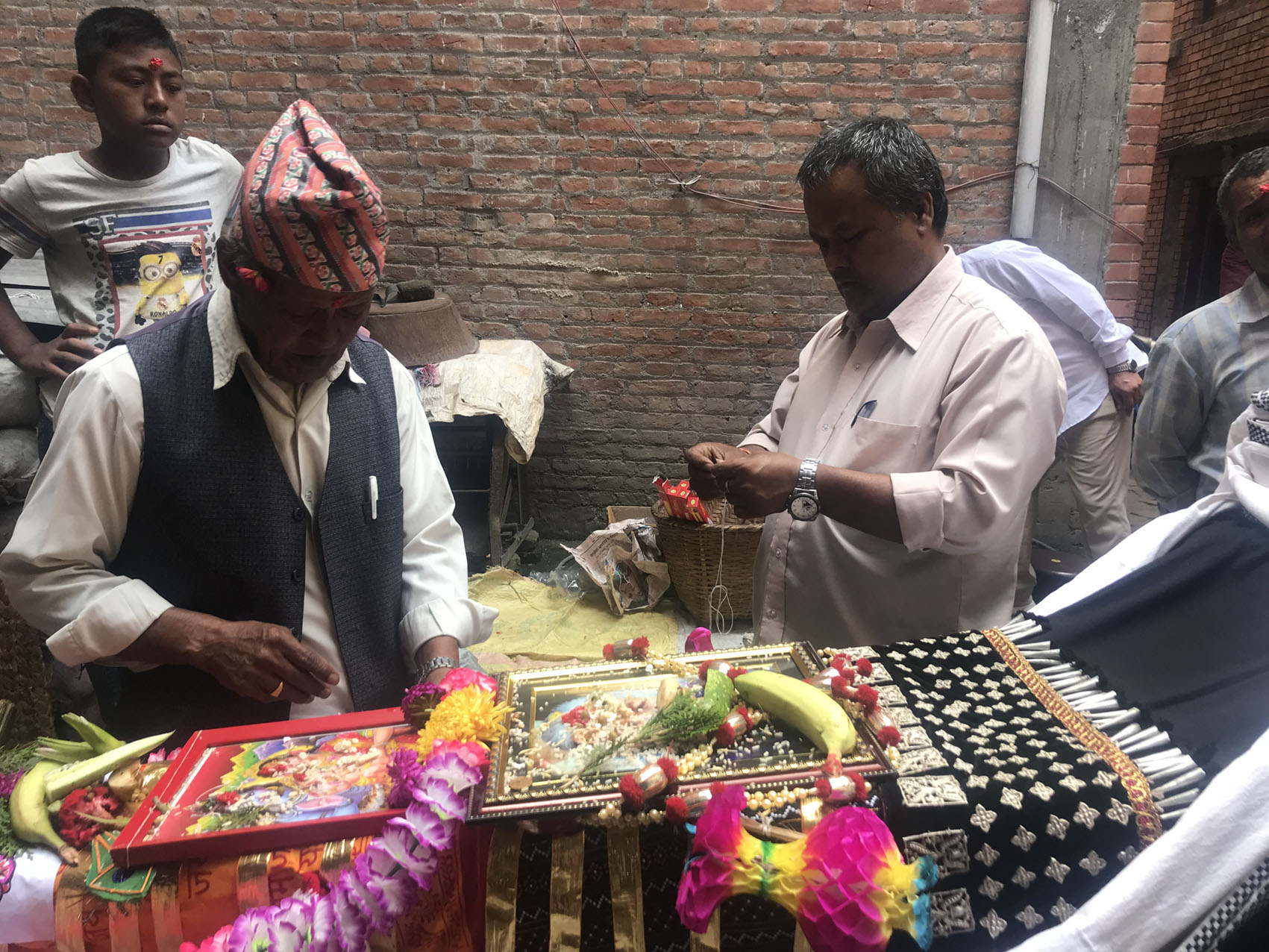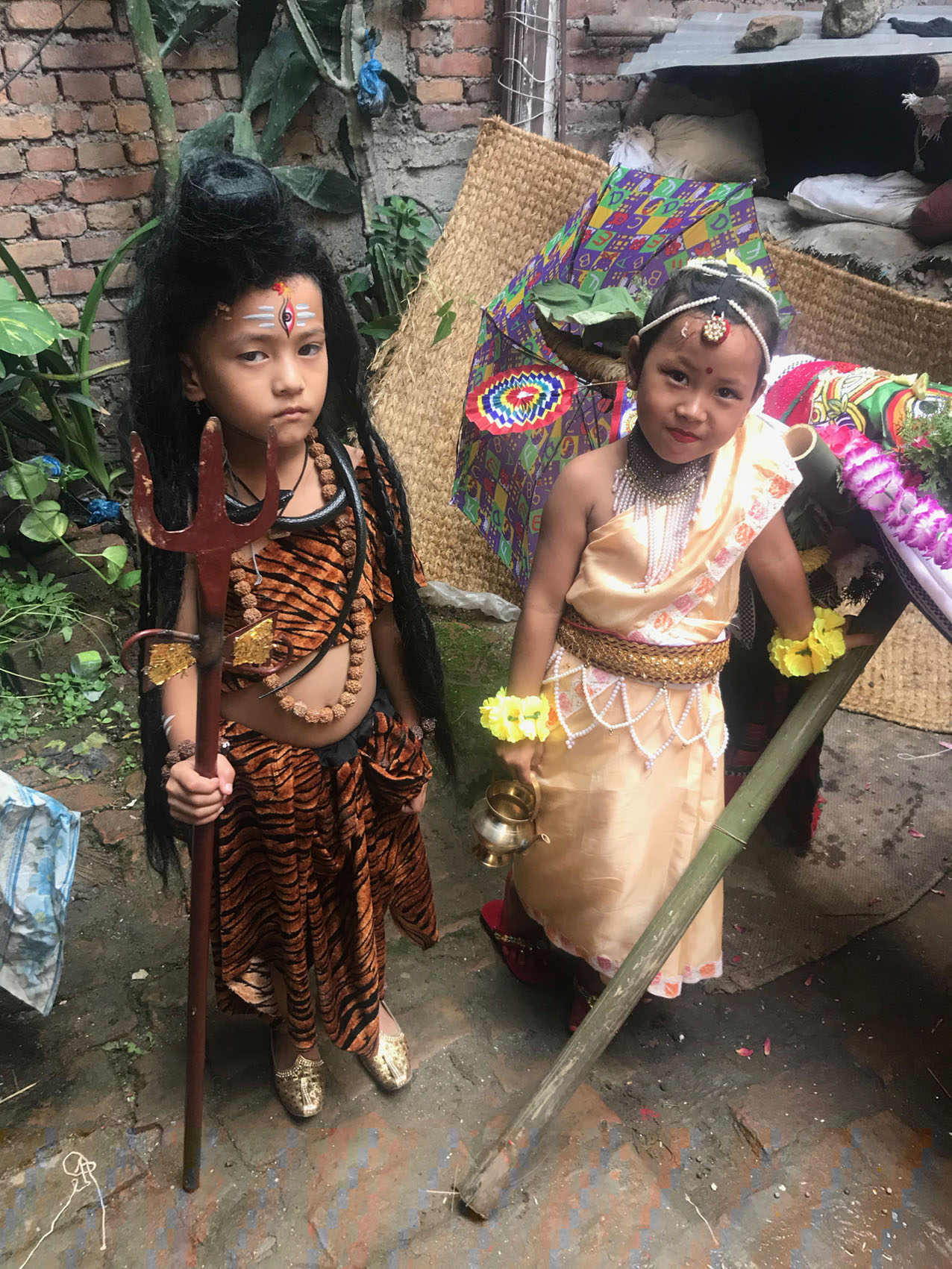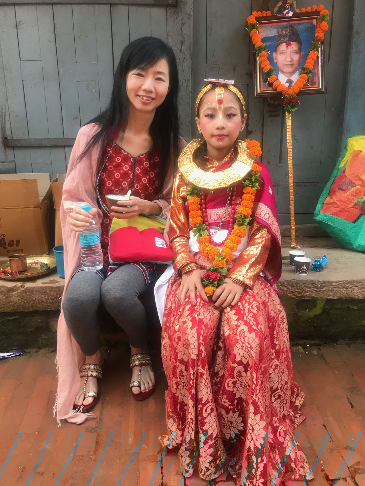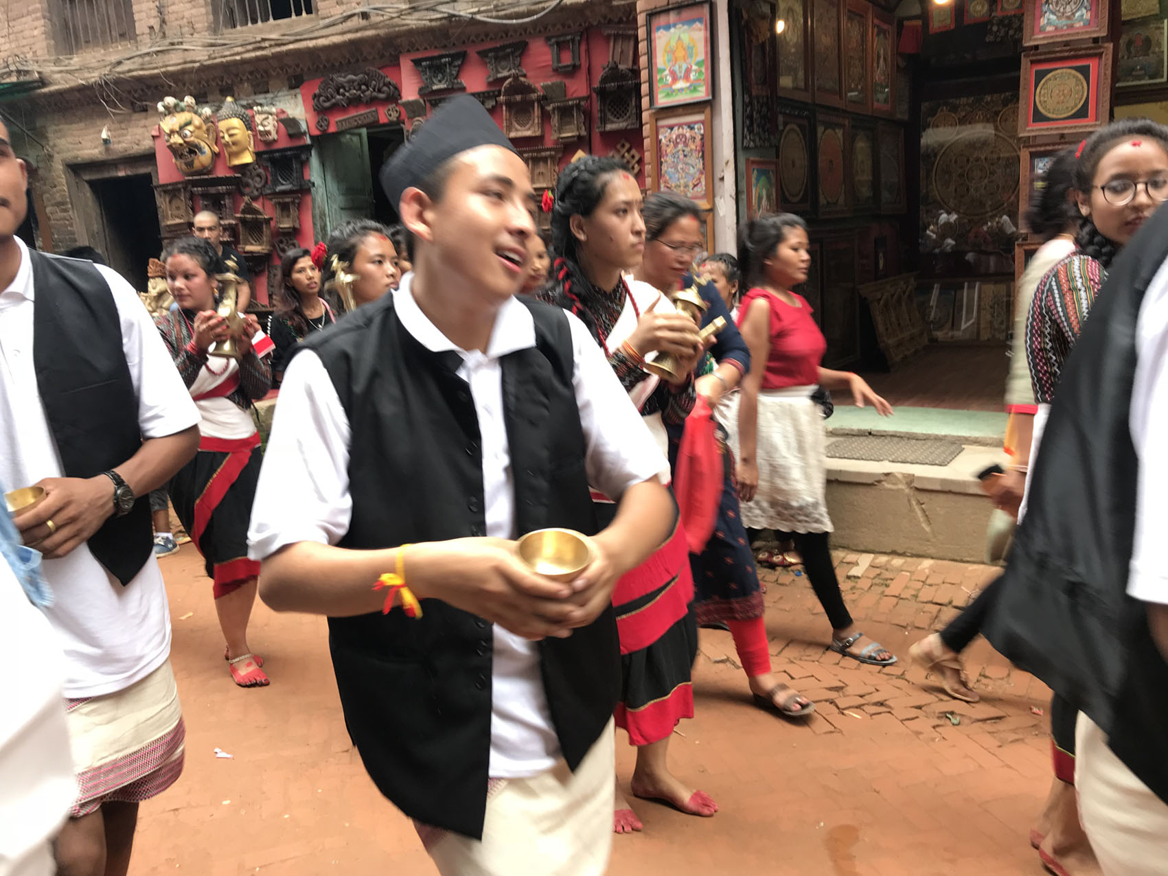 実は「ガイジャトラ=牛祭り」というお祭りは日本のお盆のようなものなのです。後ろにちらりと見えている写真の方が、この1年以内にこちらのご家族で亡くなった方です。亡くなった魂を牛が天国へ導くそうなのです。そういえば日本のお盆もナスを牛に見立ててお飾りしますね。カトマンズやパタンでは牛の仮装をした子供達が街を練り歩きますが、バクタプルのガイジャトラは最も盛大で華やかです。すごい情熱なんです☆