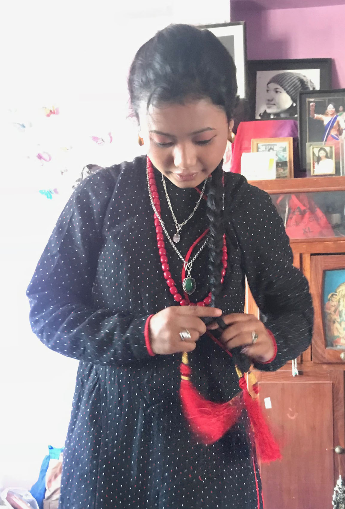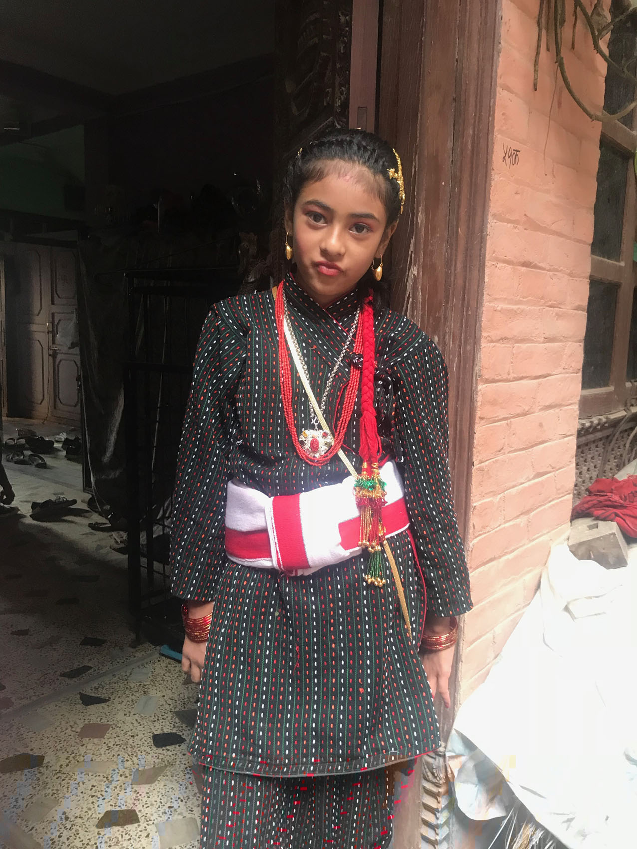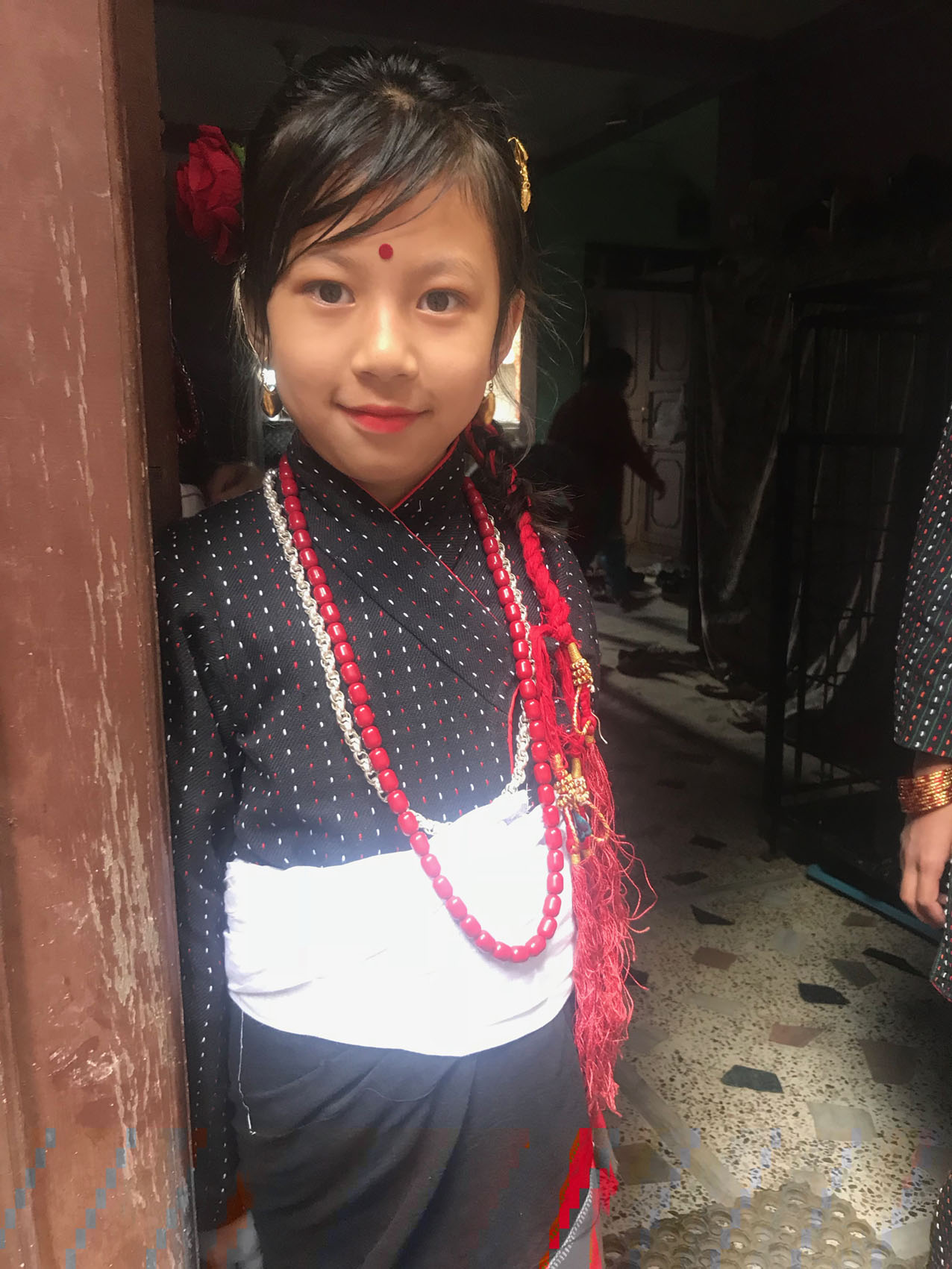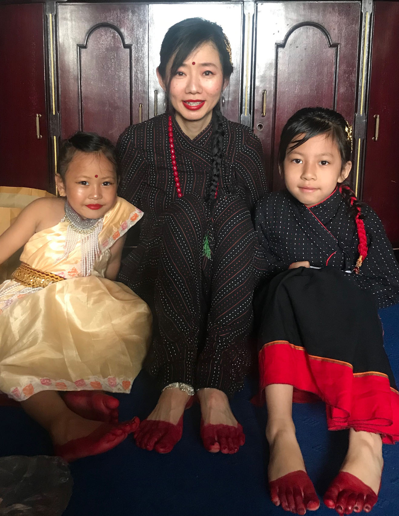 襟のところや帯が少し着物とも似ているような気がします。そしてパンツがサルエルパンツになっていてとっても可愛くて動きやすいんです!ブレスレットはできる限りたくさん、ネックレスも。そしてアンクレットは銀。頭には金色の髪飾りと真っ赤なお花。ピアスも金色。手も足も真っ赤のマニキュアです。そしてサンダルも赤。黒、赤、金が基調になっている可愛く美しい民族衣装です。