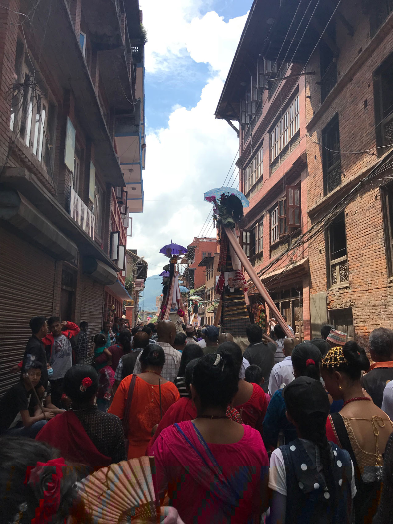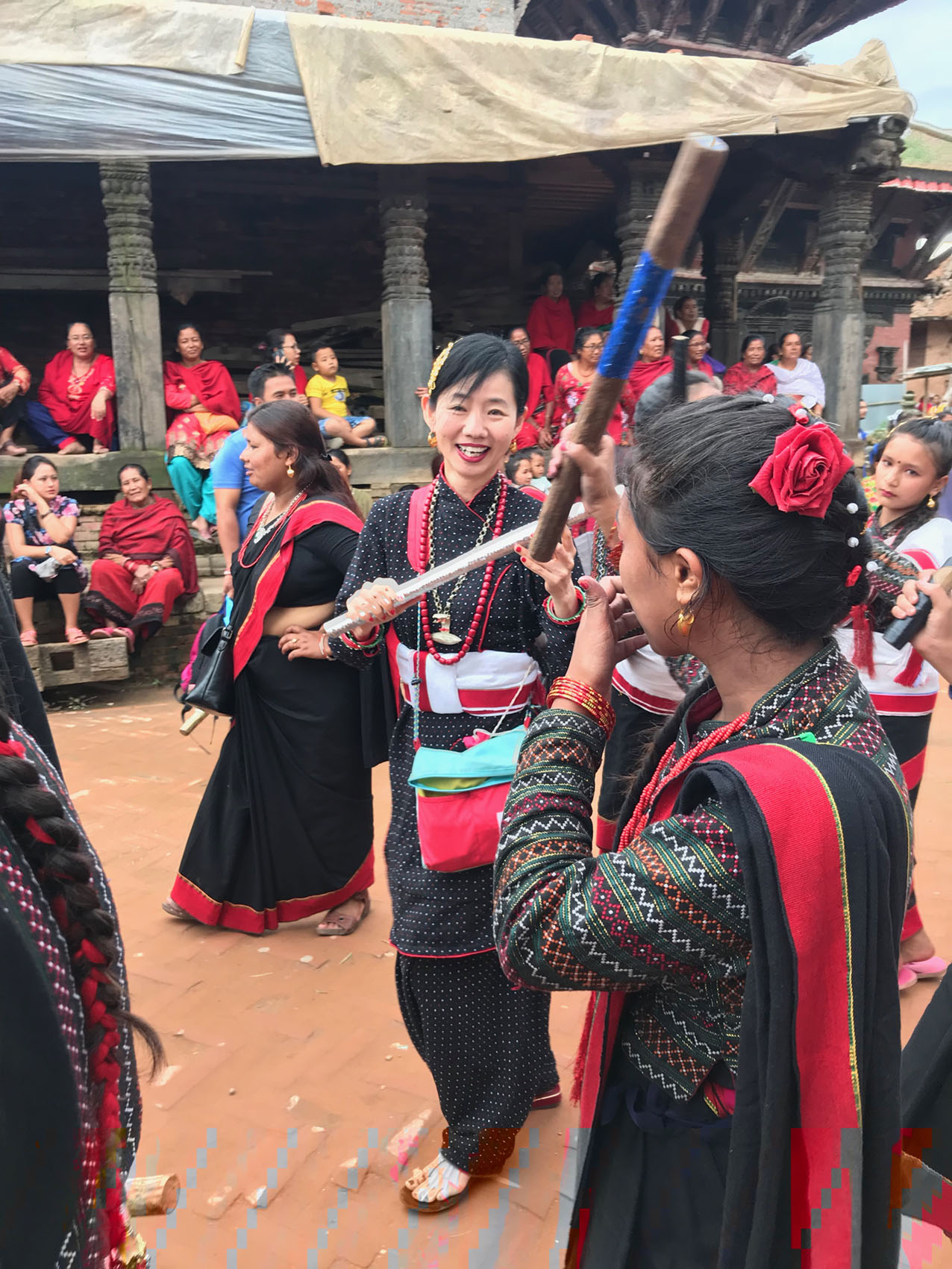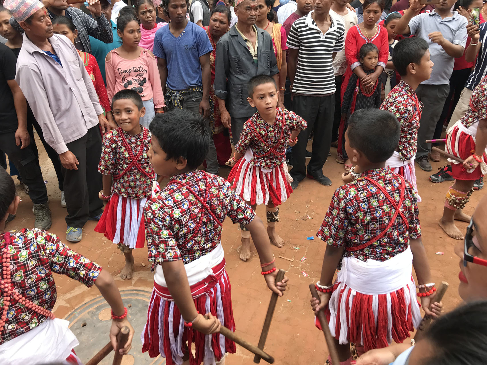 メインは棒を持って一定のリズムに合わせ、二人一組で棒をお互い打ち付けあいながらひたすら練り歩く。約8時間。そういう感じで9日間。というお祭りなのです。カトマンズの日差しは強く、汗をダラダラ流しながら練り歩きました。ただそれだけなのですが、それがものすごく楽しいのです。踊っている人も見ている人もみんな大興奮です!盆踊りもそうですが、シンプルで素朴なものって飽きにくいのかもしれません。