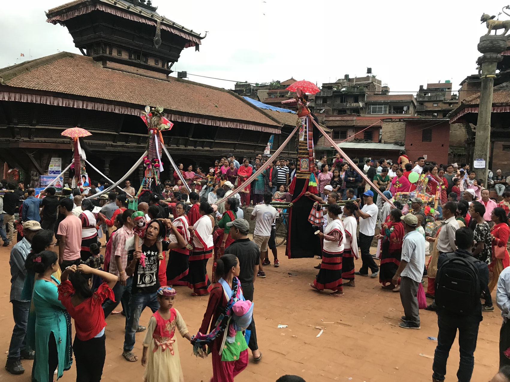 お祭りは夜に最高潮の盛り上がりを見せます。私はピーコックゲストハウスに戻り、中から前の広場を見ていました。バクタプルのたくさんある広場を順番に最後の行列が回るのです。そしてゲストハウスの前のダッタットラヤ広場が本当の最後になります。