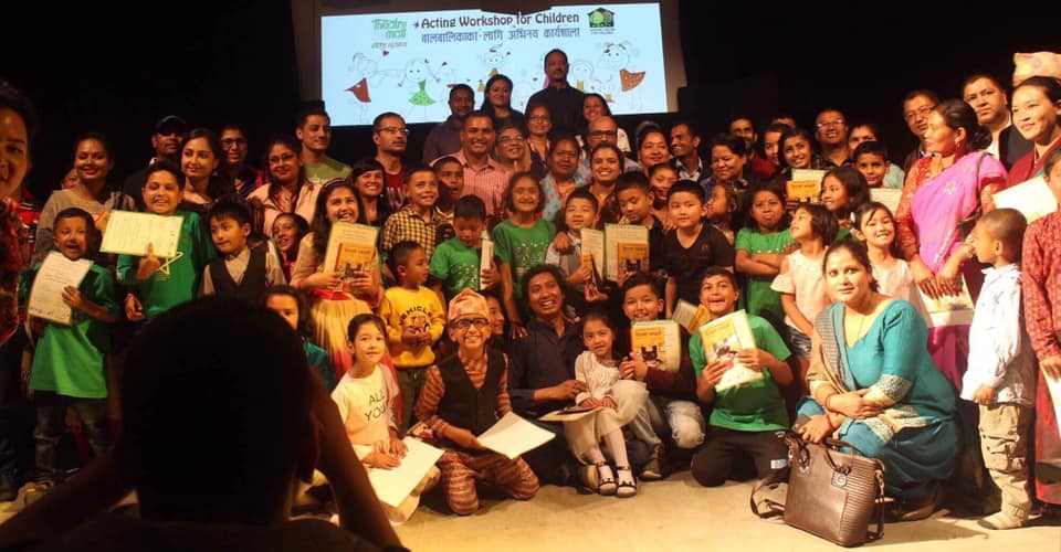 カトマンズの子供劇場が2015年の地震で壊れた後、復興しました。そこで行われたワークショップと式典で絵本が配られました。スライドで「絵本deえがお」の活動も紹介されたようです。