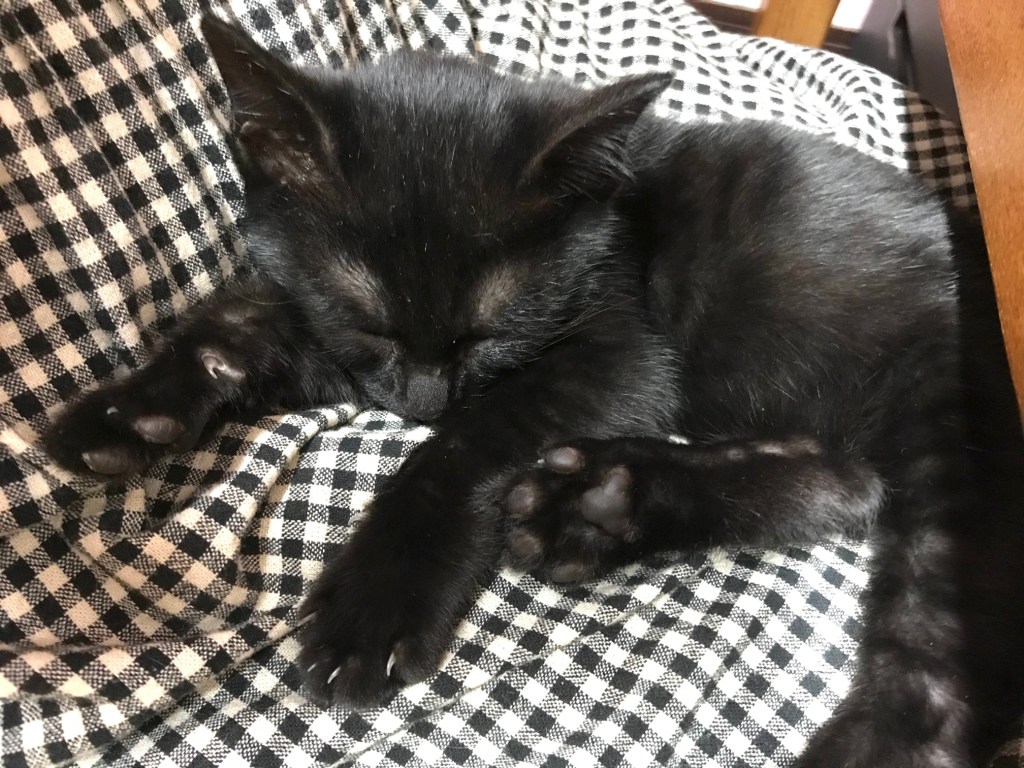 そしてそしてそんな中、なんと、わが家に生後2〜3ヶ月くらいの子猫が突然やってきたのです!またまた黒猫です♪ 修一郎も私も孫のように(子供を飛び越えて)愛でています。くすっ。