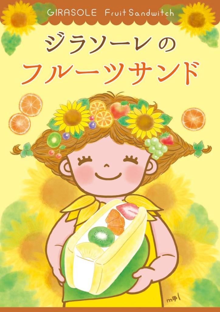 1年半前には、ピザやフルーツサンドなどのテイクアウト専門のお店「ひまわりキッチン」を遠賀町にオープンして、この4月28日に小倉のデパート井筒屋にジラソーレの2号店をオープンすることになったのです。そこでは大人気のフルーツサンドをテイクアウトすることもできるので、そのフルーツサンドのポスターを作成しました。