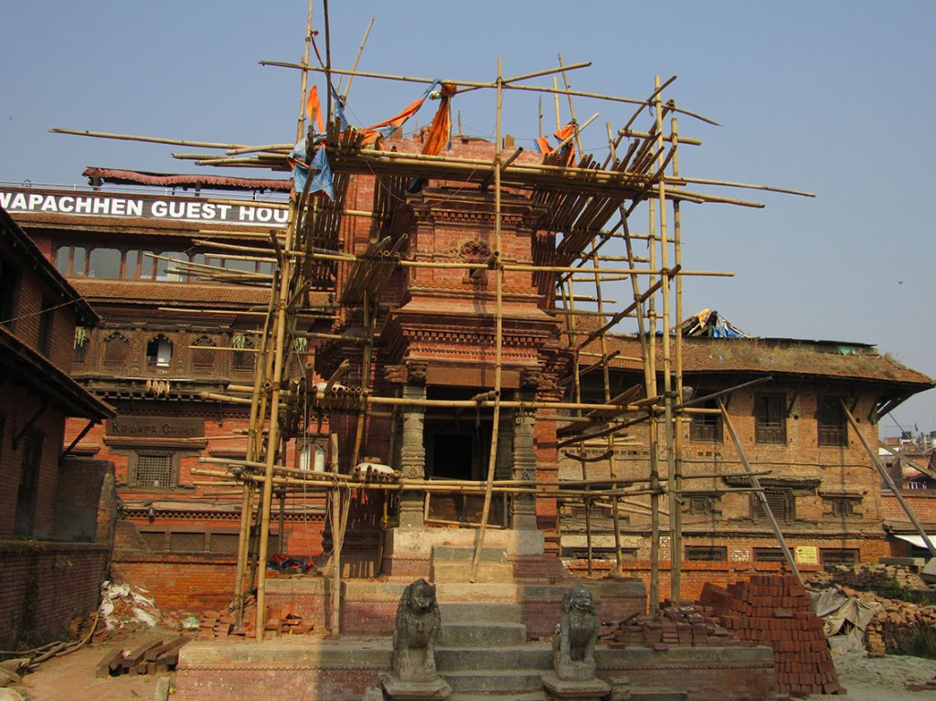 2015年の地震で壊れた建物を竹で支えています。世界遺産も竹で支えられていました。そして、お祭りになるとこの竹にお面とかが飾られて売られています。たくましい!