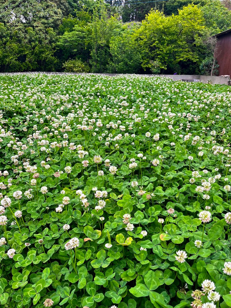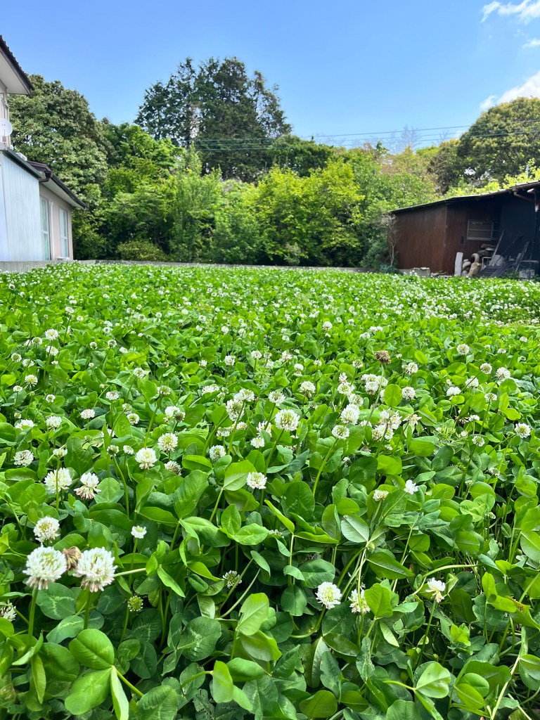 と、その前に、昨年4月の終わりから こつこつ耕し種を蒔いていたクローバー畑、白くて まるいお花が満開になりました!