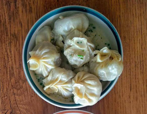 小籠包のようなモモは餃子みたいな形のものもあります。ほとんどは蒸したものにディップをつけて食べますが、スープに浸かっているのも絶品でした。