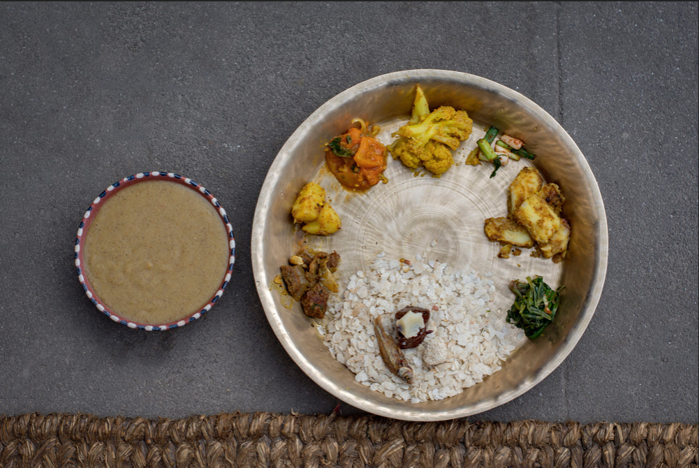 ネワール料理は、チウラという干し米(お米のコーンフレークみたいな感じ)に、スパイスの効いたおかずや硬い黒豆を混ぜて食べるネワール族定番の食事です。そして、最後にヨーグルトにチウラを入れて食べます。