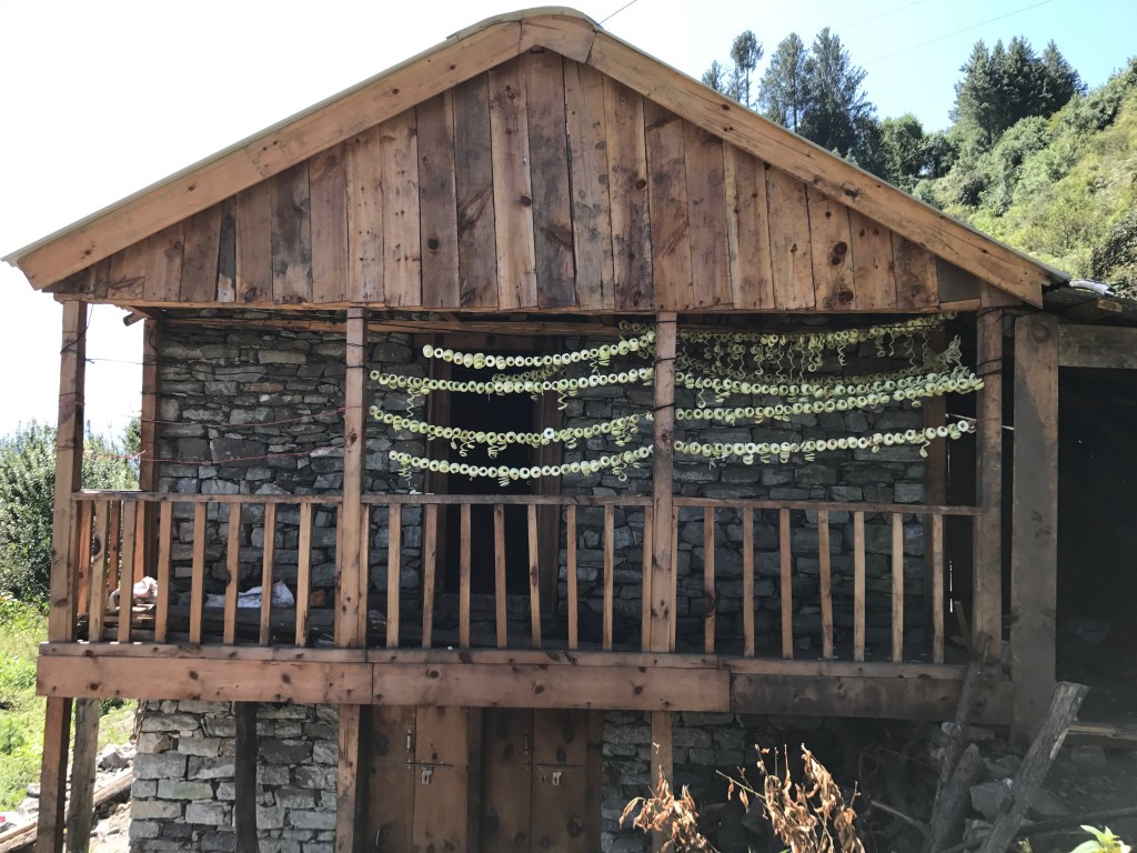 森を抜けて村が近づいてくると、ぽつりぽつり家が見えてきました。七夕やクリスマスの飾りのように、あちこちの家にりんごが干されていました。