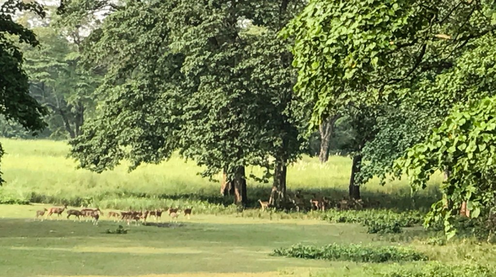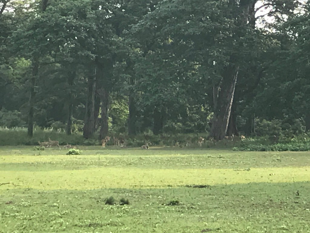 白い毛の猿や見たことのない美しい鳥たち…。そして広々とした草むらに出ると、そこになんと100頭くらいの鹿たちがくつろいでいるのが目に飛び込んできたのです!