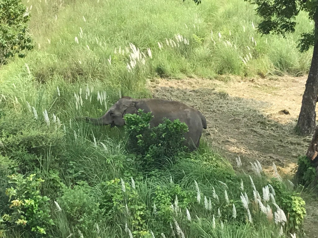 高台でお弁当を食べていると、ぞうさんもお昼ご飯を食べに近くの木にやってきました。